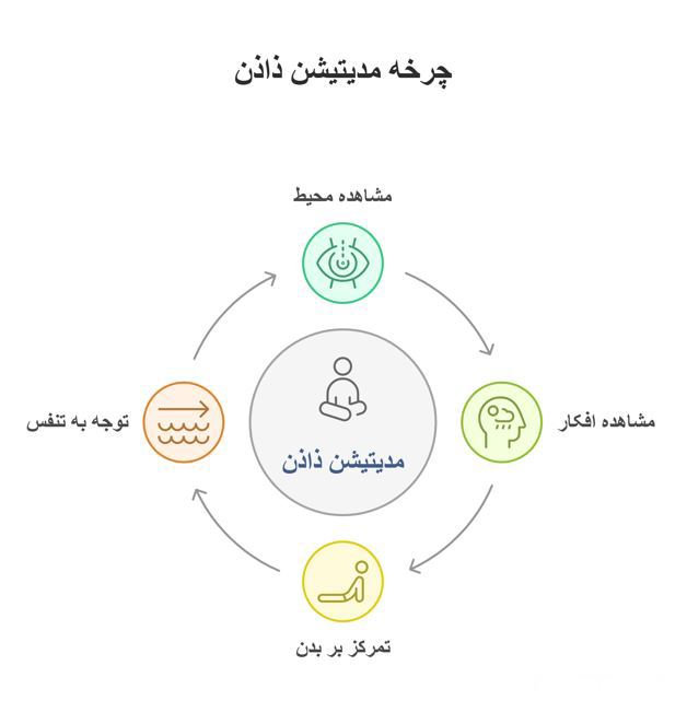 ۴. توجه به تنفس: ریتم طبیعی و آهنگ تنفس خود را شاهد باشید.